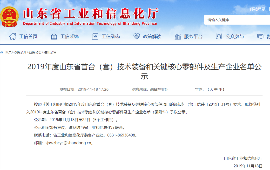 2019年度山東省首臺(套)技術裝備和關鍵核心零部件及生產企業(yè)名單公示