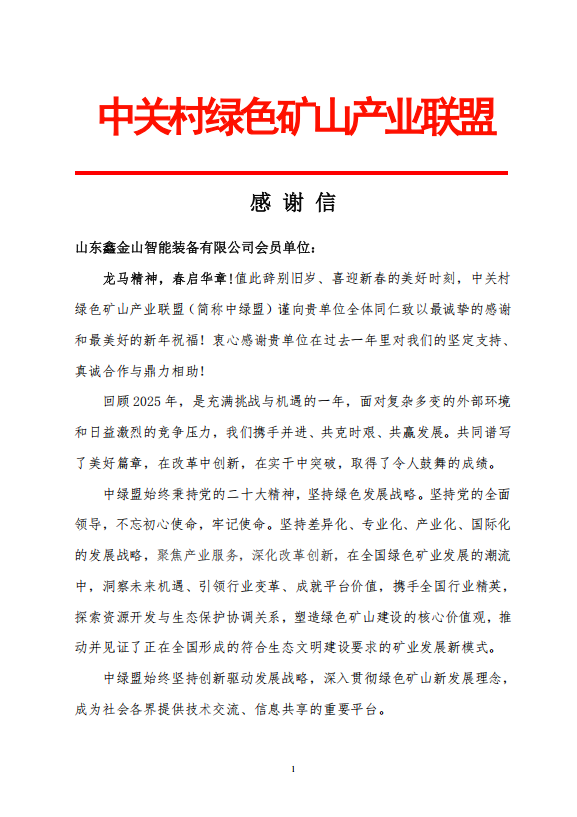 導讀:新春將至!近日,山東鑫金山智能裝備有限公司收到中關村綠色礦山產(chǎn)業(yè)聯(lián)盟(中綠盟)發(fā)來的感謝信,字里行間滿含認可與期許,這是聯(lián)盟對鑫金山深耕綠色礦山領域、積極助力行業(yè)