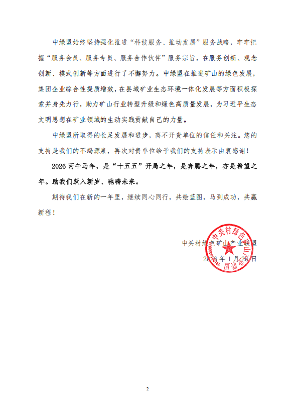 此次中綠盟在感謝信中,對鑫金山的堅定支持與真誠合作表達誠摯謝意,并展望 2026 丙午馬年 “十五五” 開局新征程。未來,鑫金山將繼續(xù)秉持綠色發(fā)展初心,以技術創(chuàng)新驅動行業(yè)變革,與中綠盟及行業(yè)同仁攜手共進,深耕智能礦山裝備研發(fā)與應用,為礦業(yè)領域生態(tài)文明建設貢獻更多力量,共繪綠色礦業(yè)高質量發(fā)展新藍圖,在新征程上馬到成功、共贏新程!