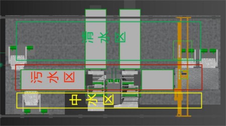 四合一集水平臺污水處理系統(tǒng),功能區(qū)域劃分,內(nèi)部循環(huán)處理, 中水回用,每噸砂石僅補(bǔ)充水0.02t。當(dāng)原料含泥量≤15%以內(nèi)不用絮凝劑。